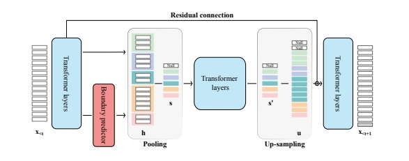 - jointly learn dynamic pooling (token segmentation) and language modelling