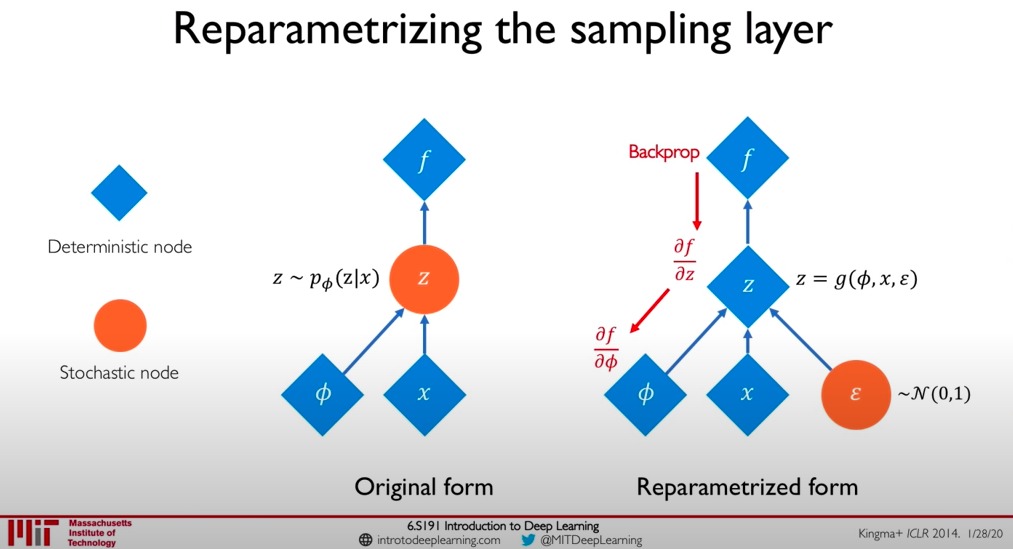 The “trick” part of the reparameterization trick is that you make the randomness an input to your model instead of something that happens “inside” it, which means you never need to differentiate with respect to sampling (which you can’t do). 6