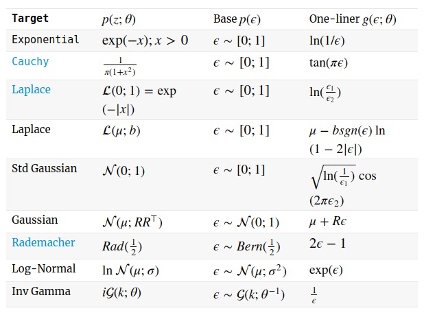 Reparameterization is a method of generating non-uniform random numbers by transforming some base distribution, , to a desired distribution, . The transformation from the base to the desired distribution can be written as , as follows 3: