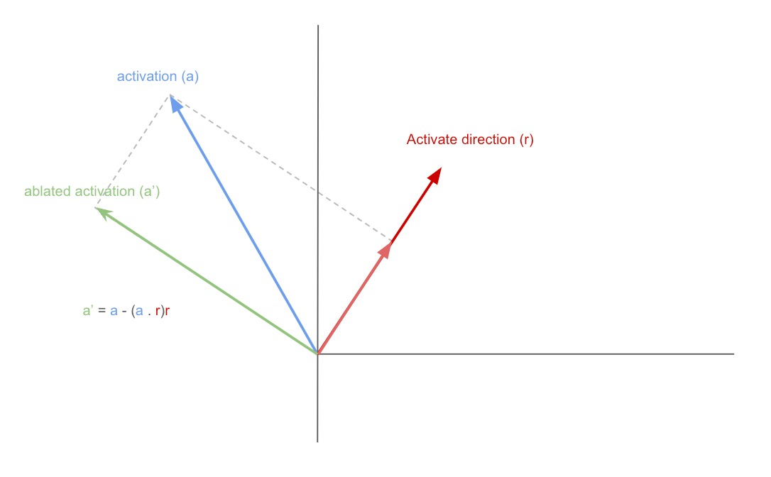 Given a “refusal direction” , we can “ablate” this direction from the model. In other words, we can prevent the model from ever representing this direction.