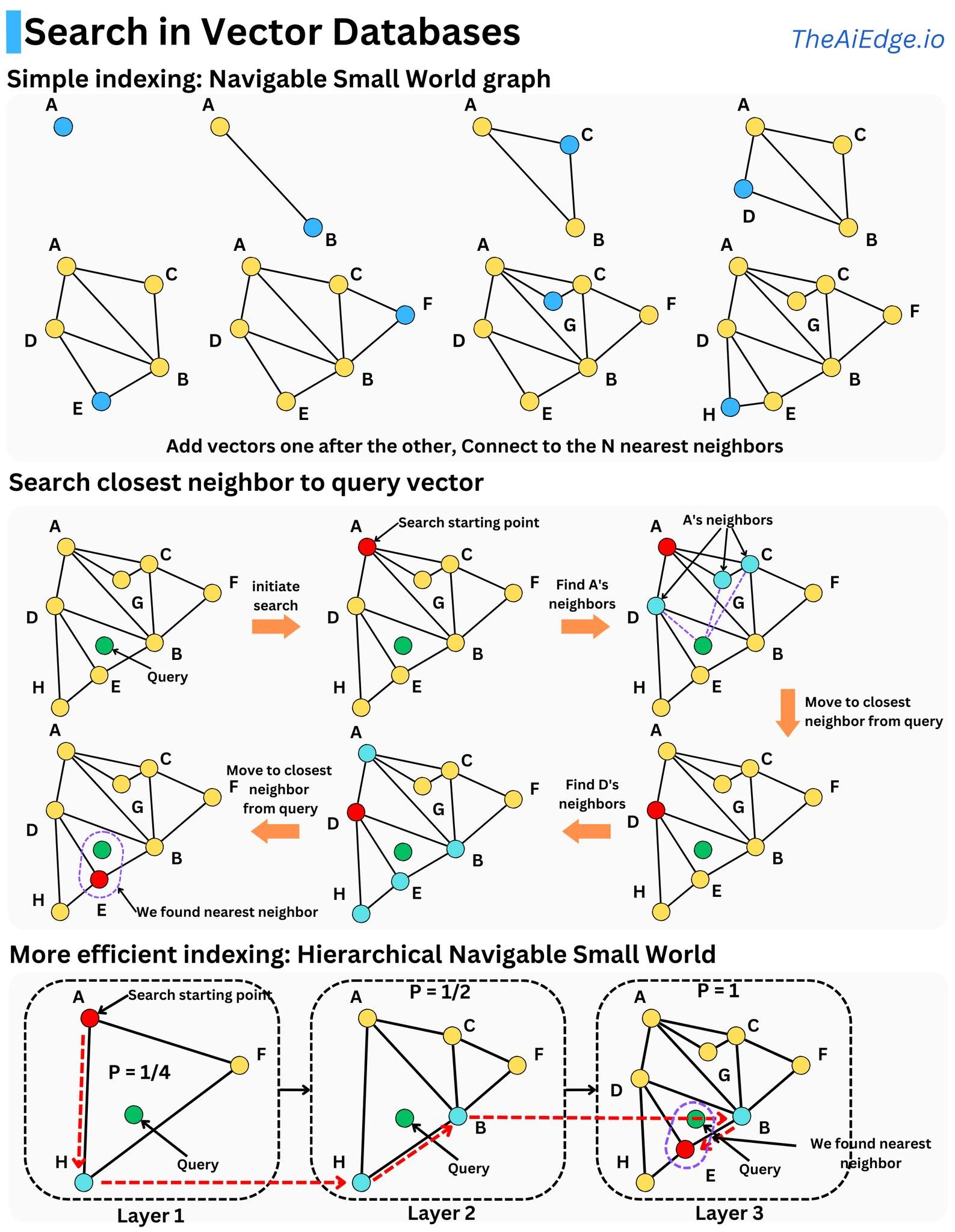 Hierarchical Navigable Small World (HNSW) is one of the most efficient ways to build indexes for vector databases. The idea is to build a similarity graph and traverse that graph to find the nodes that are the closest to a query vector.